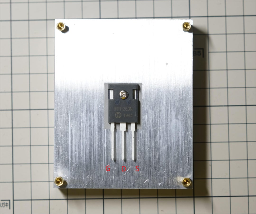 - Install the MOSFET. Place the side of the MOSFET with text **facing up**, pad the other side with a silicone pad and fix it on the heatsink with screws, with the pins **facing downward**. At this time, the pins from left to right are G, D, and S poles respectively.